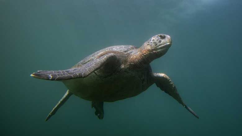Unlike tortoises, who can't swim, turtles are strong swimmers who can breathe underwater for extend periods of time. In the water, turtles are swift and agile. Sea turtles, also called marine turtles, move three to four times faster in the water than on land, which is good because they spend most of their time in the water. Sea turtles have strong flippers. The front flippers thrust the turtle forward, while the back flippers act as rudders for steering. Shells are cumbersome on land, but in water, they become streamlined and are efficient for cutting through the waves.